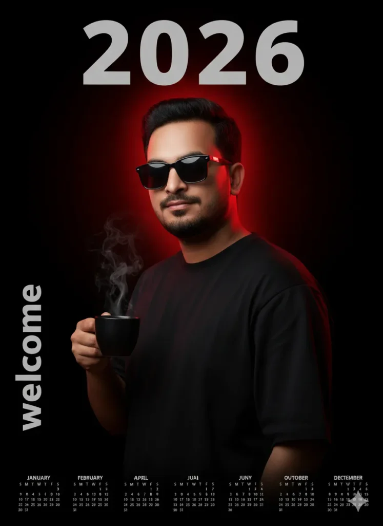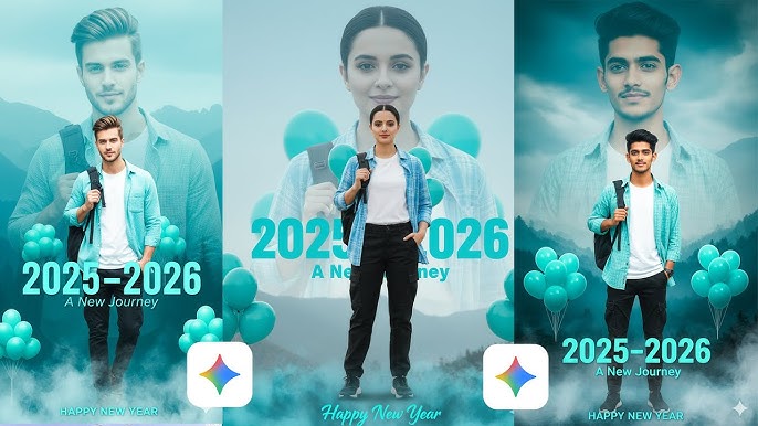 A stylish, cinematic New Year’s greeting photo manipulation. A young, cool-looking man with trendy hair (mullet-style) and sunglasses, wearing a teal/dusty green open button-down shirt. The composition is double-exposure style: a large, dominant portrait of the man in the background, with a smaller, full-body version of him layered in the foreground. Dominant text in a modern, bold font reads “2025” fading into “2026” with the subtitle “A NEW JOURNEY” and “365/365”. At the bottom, stylized, glowing cursive text says “HAPPY New Year”. The color palette is cool and desaturated, featuring teal/dusty green and a smoky, ethereal background of white and faded blue/grey. Several bright, teal helium balloons float around the frame, adding contrast. Cinematic lighting, high-detail photo, volumetric fog.no face chenge